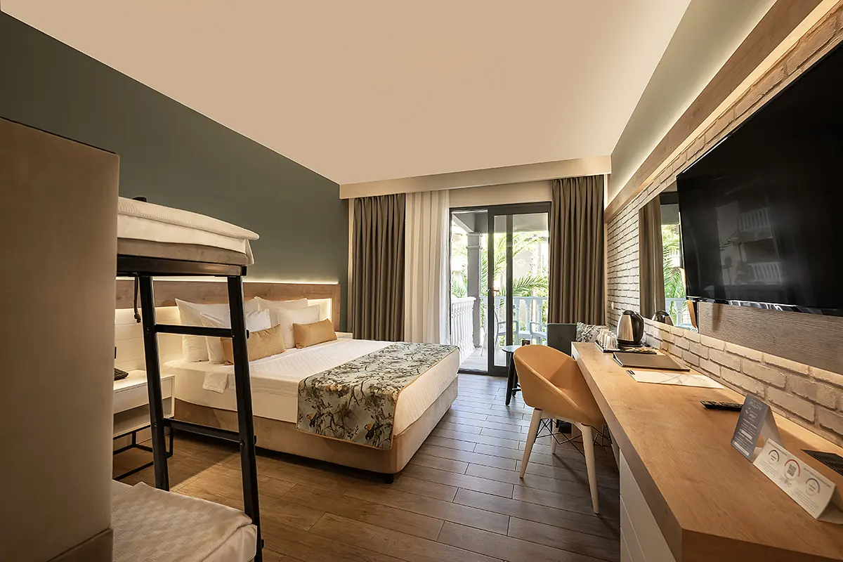 Ailece konforlu ve keyifli bir tatil için tasarlanan 24 m² büyüklüğündeki Aile Odalarımız, balkonlu ve tek odalı yapısıyla rahat bir konaklama sunuyor.