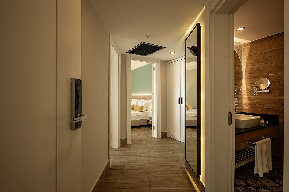 Aileler için konforlu bir konaklama deneyimi sunan 2 ayrı odalı Teraslı Aile Odalarımız, geniş yaşam alanı ve özel terasıyla tatilinizi daha keyifli hale getiriyor.