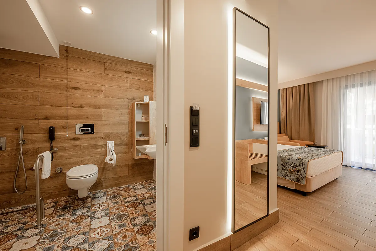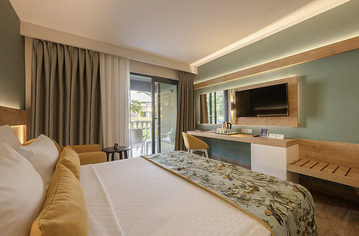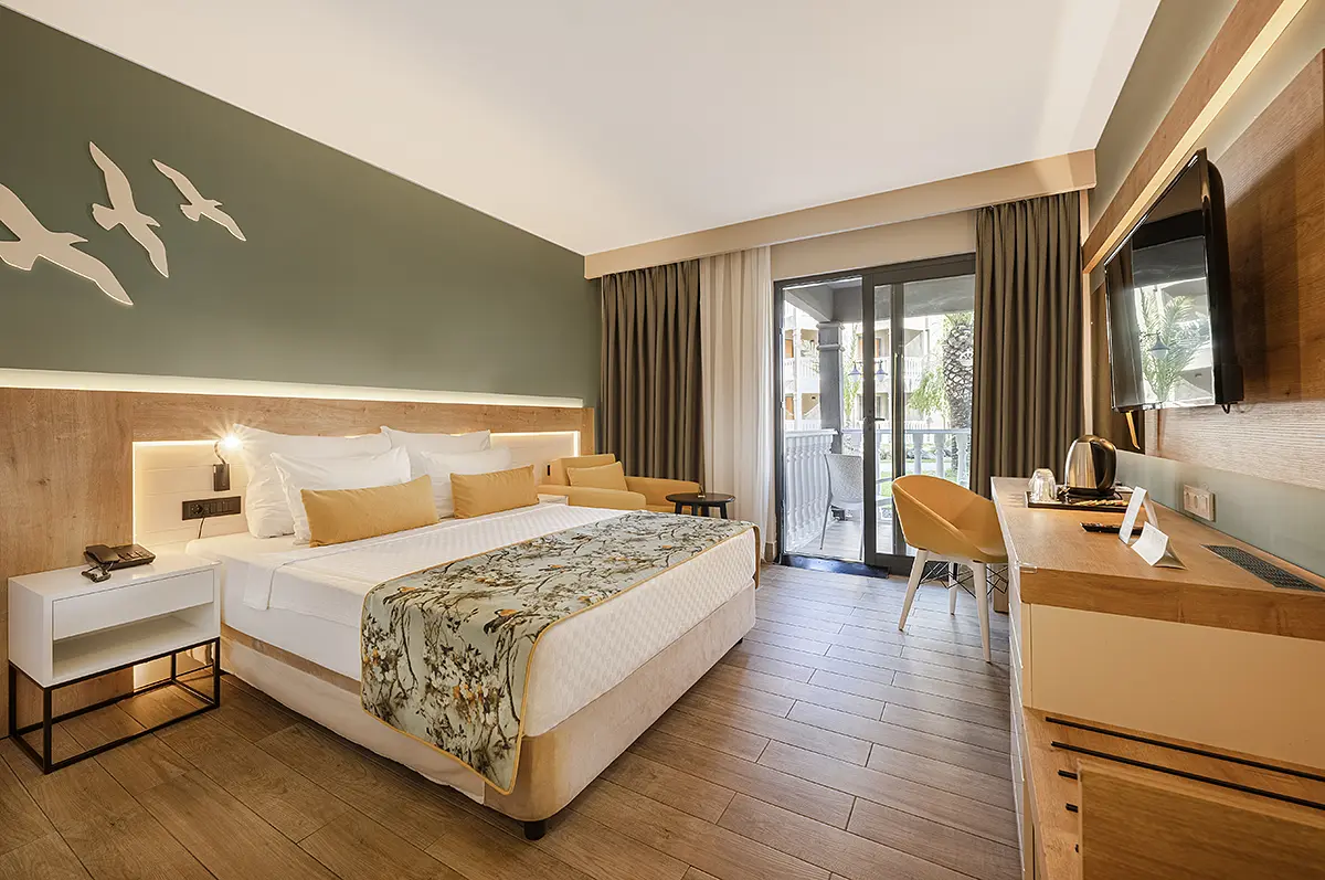 Herkesin tatilini güvenle ve konforla yaşayabilmesi için tasarlanan 24 m² büyüklüğündeki Engelli Dostu Odalarımız, balkonlu ve giriş katta kolay ulaşılabilir konumuyla misafirlerimize huzurlu bir konaklama imkânı sunuyor.