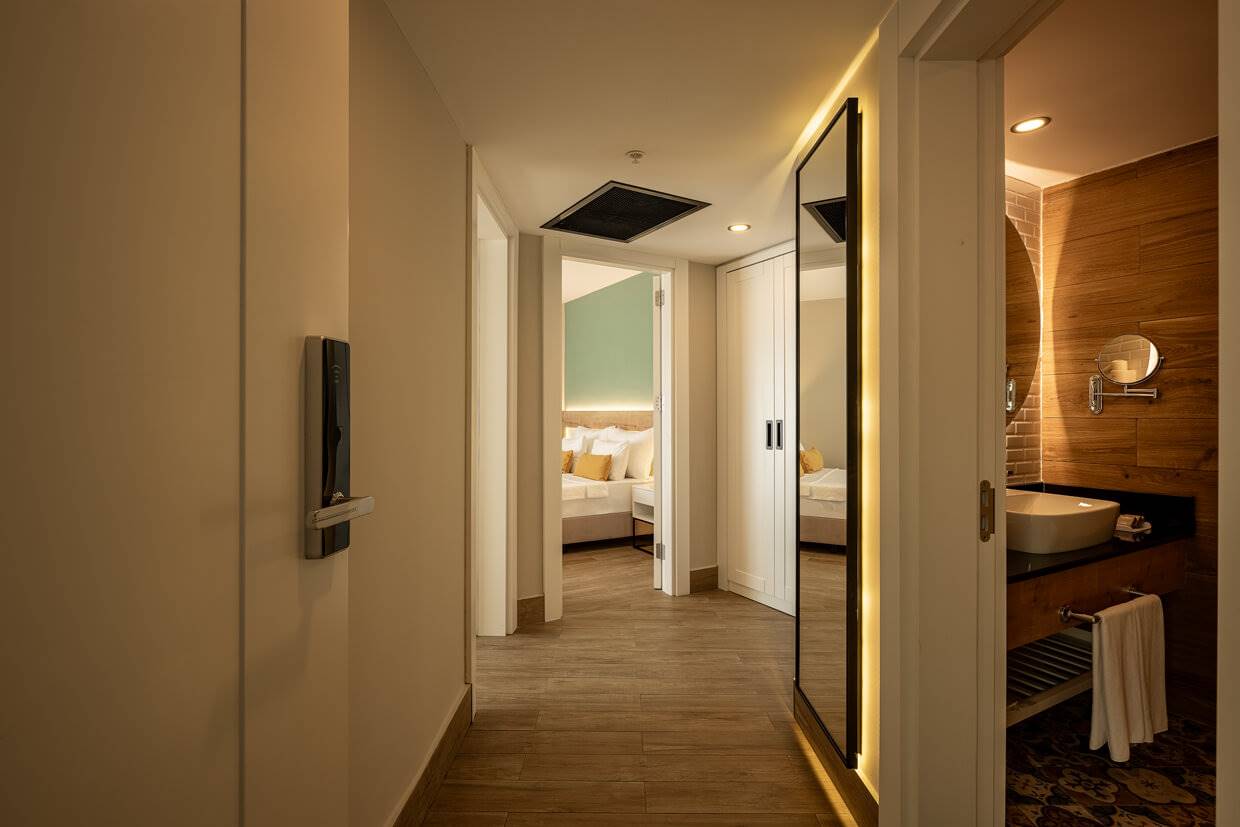 45 m2 büyüklükte olup tüm odalarda; 2 yatak odası (1 adet iki kişilik yatak, 2 adet tek kişilik yatak), klima, seramik zemin, mini bar, dijital kasa, her odada 102 ekran HD-Led/uydu TV, müzik kanalı (TV’den yayın), direkt telefon, duş, WC, buklet malzemesi, terlik, saç kurutma makinesi, kozmetik ayna, balkon, çay & kahve seti, su ısıtıcısı ve yüksek hızlı Wifi.