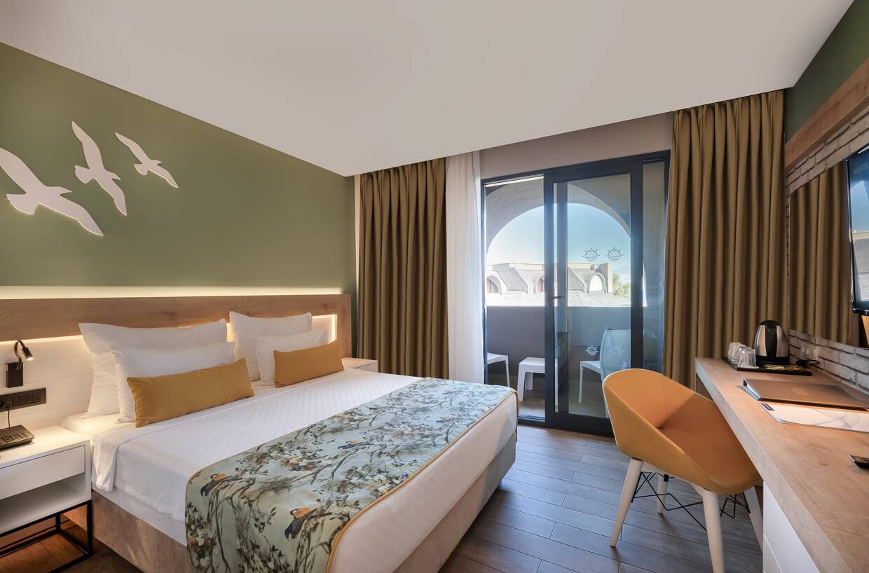 22 m2 büyüklükte olup tüm odalarda; 1 yatak odası (1 adet iki kişilik yatak ya da 2 adet tek kişilik yatak), klima, seramik zemin, mini bar, dijital kasa, 102 ekran HD-LED/uydu TV, müzik kanalı (TV’den yayın), direkt telefon, duş, WC, buklet malzemesi, terlik, saç kurutma makinesi, kozmetik ayna, balkon, çay & kahve seti, su ısıtıcısı ve yüksek hızlı Wifi.