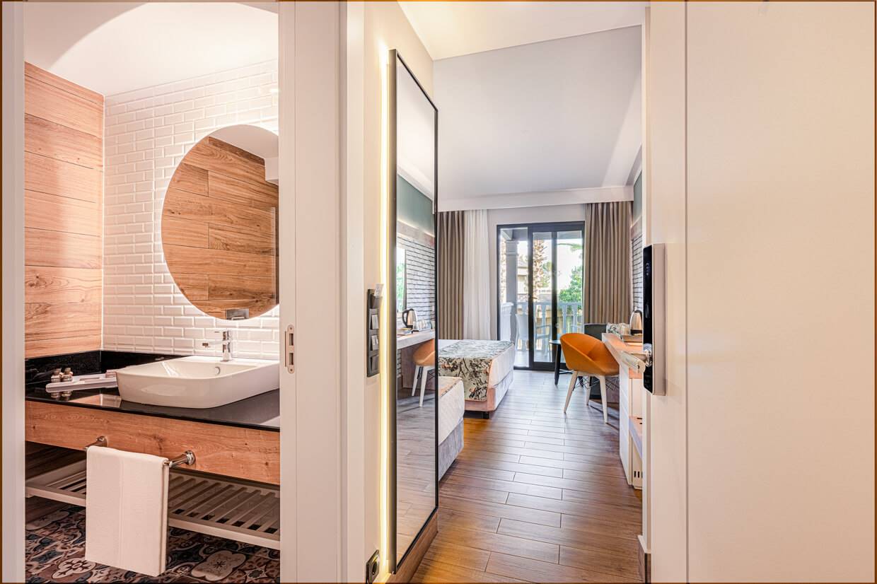 24 m2 büyüklükte olup tüm odalarda; 1 yatak odası (1 adet iki kişilik + 1 adet tek kişilik yada 3 adet tek kişilik yatak), klima, seramik zemin, mini bar, dijital kasa, HD-Led/uydu TV, müzik kanalı (TV’den yayın), direkt telefon, duş, WC, buklet malzemesi, terlik, saç kurutma makinesi, kozmetik ayna, balkon, çay & kahve seti, su ısıtıcısı, Wifi (Yüksek hızlı)